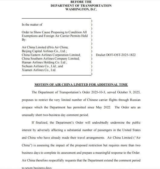 ►观察者网邓军主编赵乾坤近日,特朗普政府传出特朗普政府计划禁止中国航空公司在往返美国时飞越俄罗斯领空的消息,引起中美两国民航业的巨大关注。据国际航空业媒体FlightGlobal最新报道,国航、首都航空、东航、南航、海南航空、四川航空和厦门航空共同签署了大量时间回应评论,让人们有更多的时间来检验快节奏时期的影响。航班经过俄罗斯领空。七架中国飞机得出的结论是,该禁令一旦实施,将涉及公共利益,严重扰乱中国和美国人预订航班的票价旅行计划。报道还援引国航消息人士称,该文件美国交通部对这两项工作设定了一个不同寻常的简短评论期。国航正在审查建议限制的影响,但需要两个多工作日才能完成评估并准备大规模应对措施。因此,国航已向美国交通部提交动议,要求将意见征询期延长七个工作日。国航向美国交通部提交动议截图。民航评论员张忠林对观察家网表示,中国飞机即使暂停在中美之间飞行,也不会因为美国交通部的禁令而受到影响,这对日本、韩国等过境国来说可能是一个好处。 “如果中国飞机此时满足美国交通部的无理要求,那么它们未来将处于非常令人印象深刻的地位。”张忠林说最坏的结果是,中国有关部门也对美国航空公司发出了同样的一系列禁飞令,类似的反制措施在近年来的中美博弈中并不少见。信息来自美国政府政府法规的规定。美国法规显示,美国交通部发布文件建议,禁止中国飞机在执行往返美国的航班时飞越俄罗斯领空,并要求中国飞机在两个工作日内做出回应。美国交通部还表示,最终决定可能会在今年 11 月初做出。路透社报道称,迁美正值中美关系因一系列经贸问题而变得紧张之际。该禁令可能会影响由以下航空公司运营的部分飞往美国的航班:中国国际航空、中国东方航空、中国南方航空和厦门航空。 Flight Manager Dast观察员提供的信息显示,2025年9月,中美往返航班总数为826架次,开通航线21条,共有9架飞机运营(6家中国航空公司和3家美国航空公司)。其中,中国飞机实际运营的航班数量占50.73%,美国航空实际运营的航班数量占49.27%。有分析称,如果美国交通部的规定真正实施,中国飞机可能会考虑绕行其他航线,例如西伯利亚南部、蒙古等空域,但这会增加中国航空公司的飞行时间和燃油成本。以北京至纽约航线为例,飞行时间可能需要两个小时,这会增加数十万美元的燃油成本。北京时间10月10日,外交部发言人郭贾坤教回应路透社称,美国对中国飞机的运营实施限制不利于两国人员往来。 “我们宁愿建议美国应该反思自己的政策对本国企业的影响,而不是合理打压其他国家,让全球买家来买单。”此外,在美国交通部发布的文件公众评论页面上,不少美国网友的评论已经讲述了该文件的基本负面影响,包括:航班时间大幅延长、出行效率降低;减少出行选择,提高票价,减少市场竞争;并对环境造成不利影响。还鼓励美国交通部重新考虑并撤销或至少暂停实施文件。有美国网友认为被禁止使用俄罗斯领空后,美国飞机并不是通过改变或改善服务来进行竞争,而是通过削弱乘客的选择来“平衡竞争环境”。有美国网友指出,美国交通部不关心公共利益,反而受到地缘政治因素的怂恿。图为美国交通资料图 上一篇:社论:荷兰不应低估中方保护合法权益的决心和