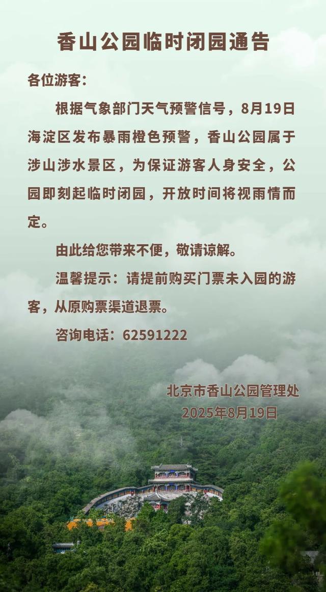 国家植物园的临时关闭亲爱的游客:根据气象部门的警告信号,海地地区于8月19日发布了橙雨的警告。国家植物园是一个令人惊叹的地方,涉及山和水。为了确保游客的安全,公园将立即暂时关闭,开放时间取决于雨水。对于给您带来的不便,请深表歉意。热点:请提前购买公园票,不要进入公园以处理原始门票购买频道的门票退款。咨询热线:82598771国家植物园北京Xishan国家森林公园关闭通知,2025年8月19日,亲爱的游客和朋友:根据气象部门,海迪安区向SA强降雨发布了橙色警告。北京Xishan国家森林公园是与山相关的地区。为了确保游客的安全,公园将暂时关闭D和开放时间取决于雨。对于给您带来的不便,请深表歉意。咨询热线:62720251(咨询时间:8:00-17:00)热门提醒:提前购买公园票的游客尚未进入公园,将独立于原始门票购买渠道持有门票退款。北京Xishan国家森林公园于2025年8月19日,北京博览会公园继续采取临时关闭步骤。尊敬的游客:广第区气象天文台已升级,并在2025年8月18日在16:00发出了黄色警告信号。预计将从1:00到19号到19日至19日,在局部降雨中,降雨量为50 mm,降雨量超过50 mm,至70毫米超过70毫米。在浅山地区,可能发生大雨引起的山洪流,泥石流,滑坡等。此外,人类区气象天文台关系在2025年8月19日3:45放松了黄色的闪电警告信号,预计将在2日的19至20:00在 - 19日的4:15在 - 19日的4:15进行闪电活动; 19日上午04:45发出了蓝色的风警告信号,预计19日晚上9点将发生短期强风。为了确保您的人身安全,北京花园博览会公园将继续临时关闭步骤,开放时间将分别给出。请给您带来的不便,要求笑声。北京公园公园将于2025年8月19日暂时关闭。亲爱的游客和朋友:根据气象部门的相关警告,为了确保游客的安全,巴达丘公园从2025年8月19日暂时关闭。开幕时间的继续取决于雨水。对于给您带来的不便,请深表歉意。请让彼此合理地安排旅行计划。谢谢您的理解和S上空,祝你幸福!热点:如果您在通过官方帐户平台关闭期间购买门票,则系统将根据原始渠道返回门票。您可以随时通过官方帐户平台关注我们的公园更新,并合理调整您的旅程。北京Badachu公园管理办公室中午,2025年8月19日,全面的Badachu Park,Xiangshan Park,北京Xishan国家森林公园,国家植物园和北京花园公园