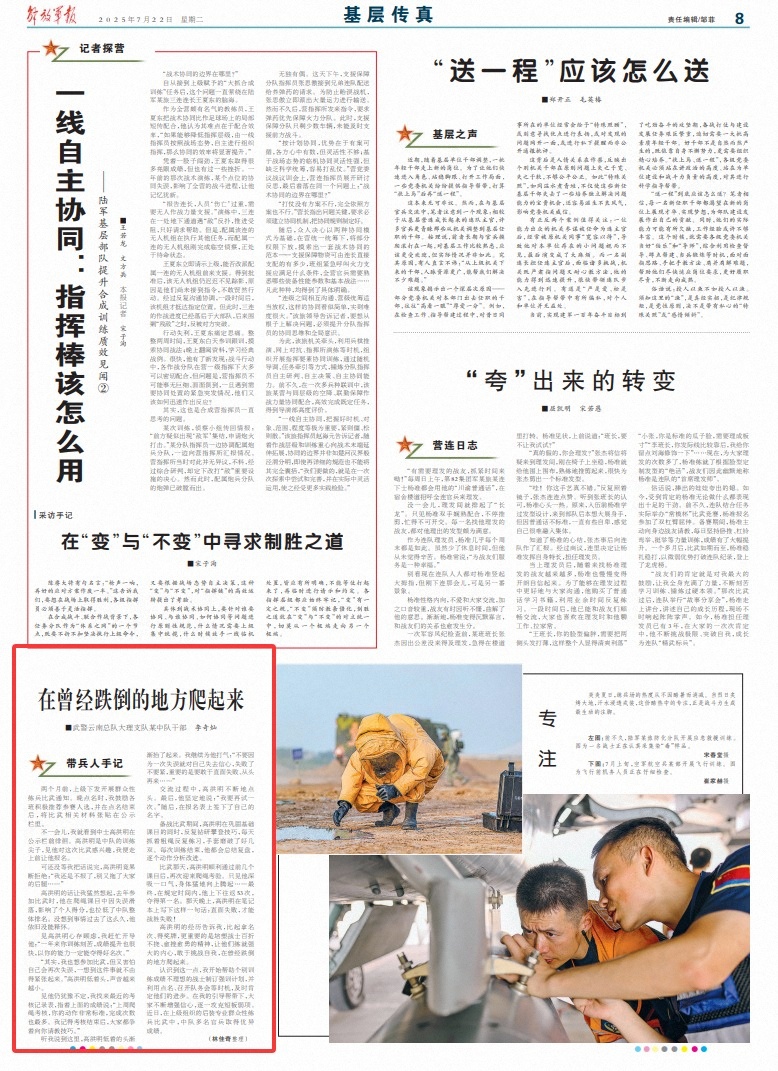 在两个月前,武装警察李基坎(Li Qican)的Yunnan军团复活节支队登上了您跌倒的地方,他的上司发布了一份通知,以进行大规模训练比赛。当名称迟到时,我鼓励所有课程积极推荐候选人,并且该名称完成后,竞争的相关材料将发布给公告委员会。过了一会儿,我看到公告板前面的高中honging中士漫游。 Gao Hongming是中队的领先训练球员。看到他对这场比赛很感兴趣,我走到他身边,要求注册。但是在我完成句子之前,高洪明拒绝决定:“我将停止举报,不要拖延一切……”高洪明的话突然使我想起了卡托托哈塔特(Katotohathat)是一个错误,影响了他的个人得分并降低了中队的一般排名。出乎意料的是,这件事已经过去了,他无法避免。看到thaT Gao Hongming记得,我急忙开明了他:“过去一年训练训练,您的分数进步很快。您肯定会在自己的能力上赢得良好的排名。” “老实说,我也想参加比赛,但是我担心自己会再次犯错。当我考虑一下时,我不禁要处理它。”高洪明降低了他的头,声音变得越来越小。当他看到自己仍然犹豫时,我发现了上述评估记录的最新形式,并指出了上述标记,并说:“上周对绳索评估的评估,您的Labelingaw非常稳定,完成的时间数量最多。我记得评估后,每个人都在听到您的技能,我说了什么。我一直让他开心:“不要因为失败而失去对自己的信心。无论您失败都没关系。重要的是要努力应对挫败感和START ...“在沟通过程中,高洪明继续点头。最后,他紧紧地说:“我想再试一次。 “然后,他以注册形式签署了名字。在竞争准备期间,在结合主菜的目的的同时,高洪明伸向主菜,一再研究高hongming浓密的绳索日,他的手套却厌倦了某些成对的人,他将再次完成训练,评估,评估,并在竞赛中进行竞赛,并在竞赛中获得了成功。在攀爬绳索的审判中,他深吸了一口气,突然他的身体起床了……在指定的时间内,他在那天晚上赢得了53次,赢得了第一名。Portant要培养士兵的不幸和勇敢的精神,以便他们可以创造一个坚强的心,努力挑战自己,并从他们跌倒的地方站起来。认识到这一点,我开始帮助训练成绩不佳的训练成绩不佳,并利用命名和举行团队会议的机会及时确认他们的发展。在我的指导和帮助下,每个人都继续增强他们的信心,并仅仅克服自己的弱点。最近,在上级组织的专业大众培训比赛中,许多中队官员和士兵取得了不错的成绩。 (由Lin Jiaqi累积)