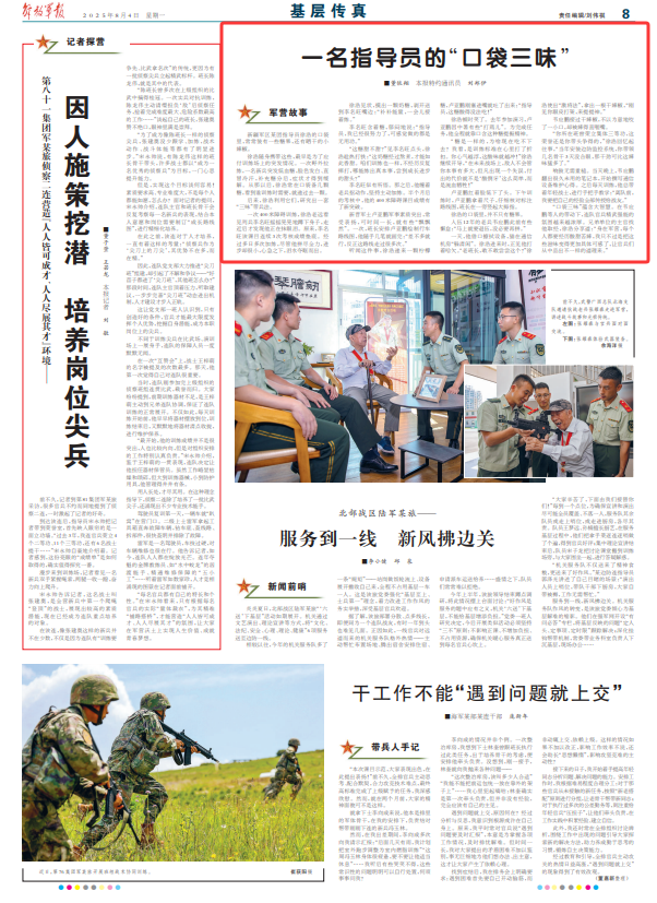 导师的“三种口味”是由人民解放军特别写的-Day -Day liu Zhengyi Xu Hao,他是新疆军事地区生活方式的老师,经常含有一些糖果,口袋里有一些糖果和干胡椒。 Xu Hao首先将其带到培训区域中的紧急情况。在野外训练中,新兵突然患有低血糖,他的脸苍白而冷汗。添加糖后,症状缓解。从那时起,徐浩经常把一些糖果放在口袋里,当他看到需要培训的人时,他会给一个糖果。后来,Xu Hao用它们制作了一系列“三种口味”来统治军事方法。在接受400米的障碍训练中,徐霍看到了远处的私人西里·米格旺(Sili Mingwang)蹲下。当他接近时,他意识到自己正在擦干眼泪。这是李明旺的标记是在连续三个评估的过程中。经过几天和许多技能,即使他尽了最大的努力,他的发展也很少全部。快点,眼泪。看到它,Xu Hao拿起了牛奶糖果,窥视了它,并将其发送给Li Mingwang的嘴:“掩盖能量,然后继续训练。”李明旺抓住了糖果,并沮丧地说:“解释,我努力工作,但我觉得我所做的一切都是毫无用处的。” “这糖很甜吗?”看到李明王的点头,徐霍在铁很热时刺了:“煮沸后,这种牛奶糖果是如此甜蜜。我们的练习也是如此。withoutrepeatepeatpeating -Repeating blows,我们如何训练和培训真正的技能并品尝真正的生长和发展的甜味?”它在他的嘴里:“讲师,这糖真是太酸了。” Xu Hao立即微笑。去年,由于中风而言,卢·亚本(Lu Yapeng)有点“渴望”。为了完成任务,他依靠处理这种糖来在整个过程中提高他的精神。“糖是一样的,你现在不能现在吃?我认为这是因为训练标准是e在您的心中打折。您越多,您的精神就越酸!在未来的战场上,敌人不会照顾你的能力。如果您犯了一个错误,那么您付出的价格不像“酸牙”那样简单,而是血腥的牺牲! “卢雅本用红色的脸降低了头。在日本的训练中,卢雅彭(Lu Yapeng)表演了一名领导者,并仔细检查并标记了路线图。小队的负责人给了拇指。Xu hao的口袋不仅是一个糖果。在军队中的candyo candyo却有点懒,以前有点懒惰:“我很快就会从军队中释放出来,很快就会打架。在Xu Hao进来时,他正在ernagion吟声。快来刷新自己。不小心,但是辣,她拍了拍嘴唇。 “您的班级赢得了第三阶段的集体功绩。您带领竞争荣誉。”徐浩回忆起三天,而你的热情比这种辛辣的味道更加激烈。 “不需要成为鼓的重锤。那天晚上,魏彭(Wei Yingpeng)拿了一本笔记本,说她很久没有使用过,开始写她维护通信设备的经验。在那之后,她每天训练,她总是带年轻的士兵来教步骤 - “在离开团队之前,我将与同伴一起度过所有的经验。 “三个口袋”包含了巨大的智慧。在Wei Yingpeng和其他人的领导下,公司官员和士兵的环境变得越来越强大,变得越来越强大。兄弟单位的负责人来找他从圣经中找出,徐浩分享道:“在军事营中,每个人都必须体验起义。我只是使这些口味变得更加具体,清醒,以便官员和士兵可以从他们那里品尝不同的事实。 “