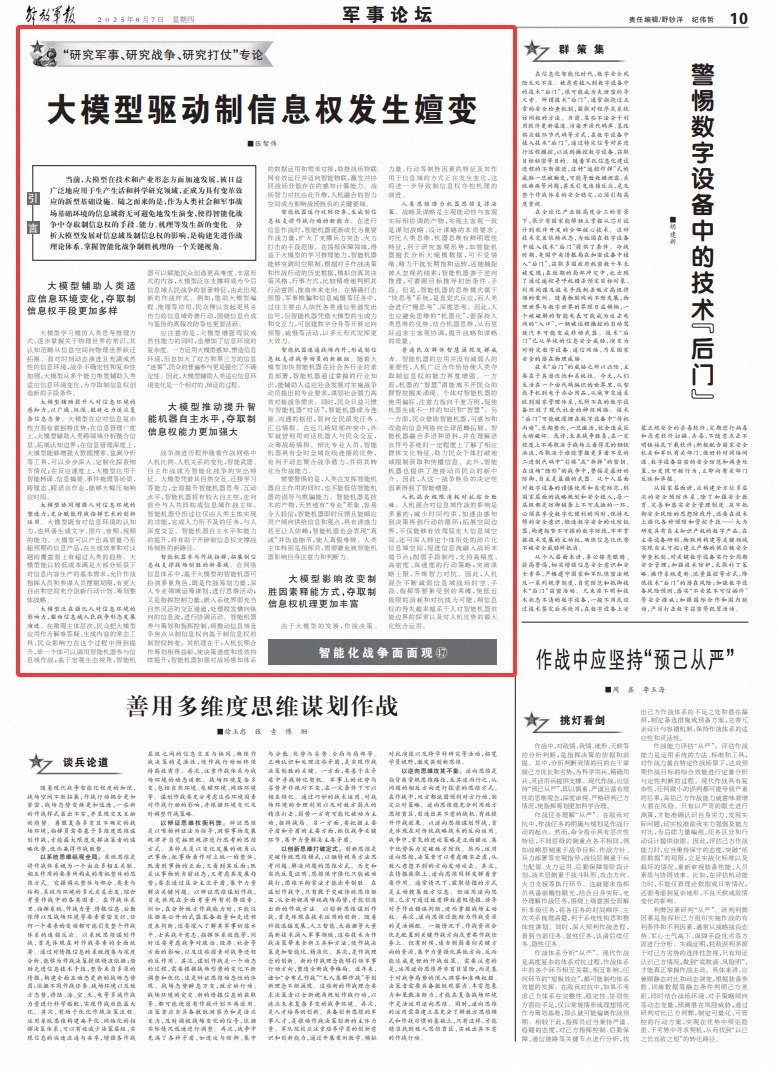 大型模型信息权的转变正在推动■张Zhiwei目前引用的,大型模型可以加速其技术和工业形式的发展,并在劳动,生活和科学研究领域更广泛地使用,并成为一种新的基础设施,并影响了转型。以下是信息的领域,它是人类社会和军方战场的主要环境,不可避免地会改变,为占有智能战争中信息权的方式,能力,机制等带来新的变化。检查大规模模型开发对信息和信息控制权领域的影响是开发先进的理论战斗系统并掌握智能Waraan的获胜机制的关键观点。大型模型有助于人们适应信息环境的变化,并占据了信息的权利。大型模型已经学会了模仿ND推理方法逐渐掌握了物理世界的常识,其认知范围已从信息空间跳到物理世界。面对持续的变化和可能的环境信息,战争的不确定性和复杂性加剧了。大型模型可帮助人们适应来自许多技能的信息环境的变化,从而创建了夺取补贴信息权的新方法和条件。大型模型有助于改善人们对信息环境的看法,并适应具有广泛区域,深度和敏捷性的复杂环境信息。大型模型在处理信息的复杂性方面具有独特的好处:在管理信息方面,大型模型可帮助人们查看跨域并整合信息并扩大认知边界;在信息管理深度方面,大型模型可以增强大型数据搜索,监视和评估等工具,并可以探索S的细节tep -step和-customize;在反应速度方面,大型模型用于诸如智能翻译,信息摘要,事件分类等方案。大型模型共同起作用,以增强人们塑造信息环境的能力并充分赋予Makababagong战斗命令命令艺术应用程序。大型模型能够识别信息环境,并且还具有产生文本,照片,音频和视频的能力。大型模型可以产生高质量,甚至超出信息产品的期望,其趋势在发电效率和问题范围方面超过了人们。大型模型可以满足在大多数情况下以较低成本制作信息内容的基本要求,从而使战斗和员工指挥官能够摆脱其局限性,拥有更多的自由和空间,以使行动计划和计划通用技术完全现代化。大型无处不在模型增强了人们对I的影响信息环境并驱动埃博鲁斯山在信息领域的公民战争形式。在微观主体级别上,人们使用大型模型的应用作为解决问题并回答问题和开发内容的普通工具。在此过程中,人们的影响力得到了增强。一个生物可以致电智能机器参与信息域操作;根据宏观生态学的观点,智能机器可以使人们能够创造更高的困难和丰富形式的内容。大型模型的惊人支持将是人们将来在信息领域的人们的著名特征,因此将出现新的战斗风格。例如,借助大型编程,推理和其他操作模型,公众可能会引发更多的感谢域的意外攻击信息,以及围绕信息综合和不正确身份的真实和错误攻击和防御ity is also more active.应当指出的是,尽管大型模型提高了控制潜力的能力,但它也提高了信息环境的复杂性。一个大型模型看到并塑造了信息环境,但也增加了其他当事方与第三方之间信息的“雾”,人们的一般参与进一步增强了不确定性。 Therefore, it is a relative -child and dialectical process to help people adapt to changes in the information environment. The large model promotes improving the level of the autonomous intelligent machine and the ability to occupy control rights rights. The evolution ofWar was accompanied by changes in the proportion of human-machine and machine relationships in battle networks. The intelligent weapons and autonomous battles have become known features of intelligent warfare. In natural contact, transfer of learning and other capabilities, the large model will comprehensively imp宣传智能机器的思维和互动水平。智能机器将具有更多的自主权,并朝桌子的前部移动,以发展与人类的领域战斗。智能机器共享仅由人类受试者实施的功能,超越人类能力的完整活动,并与人类进行了深入的互动。提高智能机器的自主权和能力水平将有助于开放新的途径,通过纳入信息权利来支持战场。智能机器参与战斗秩序,并为信息系统提供新的领域,以支持战场的成功。在网络信息系统中,基于大型模型的智能机器可以扮演许多角色,这些角色都是战斗力,在专业领域的深入计划和计划以及进行心理活动;他们还授权和控制力,这些力在系统接口中出现作为一种自然而灵活的交互通道,在水平和垂直方向上处理和接收信息流以及进行协调的活动。智能机器参与计划和控制,这将促进基于信息控制权的情报控制权的竞争重点。机制是:彼此适合的长期合作和人机计划,因此决策速度和质量效率的速度继续提高;智能机器加强了数据应用程序,并要求战争系统对接,促进互联网战场的有效运作,并转移到智能的物联网,并刺激和调整计算战场战场理解的能力。战场情报的对抗已经升级,人机整合的知识空间也有bEcome是影响战场结果的主要领域。智能机器执行进攻和防御性的MGA任务,并通过协调信息权利来支持支持战斗行动的新功能。在信息战役中,智能机器逐渐增加了战斗的基本力量,扩大了支持攻击和袭击力量的方式的范围。在情报支持领域,由于研究的能力和大型模型的推理,智能机器可以打破时间和空间的限制,模仿和模仿他们的决策风格和劳动力,并准确地确定其目标,并根据对手冲突决策的历史数据基于历史数据来减少其未来方向。在诸如对攻击,军事欺骗和信息退化的准确警告等活动中,过去,人们主要是各种通信渠道的用户,但是智能机器可以创建数字克隆和其他活动,以各种形式执行有针对性的早期警告,破坏和其他活动。智能机