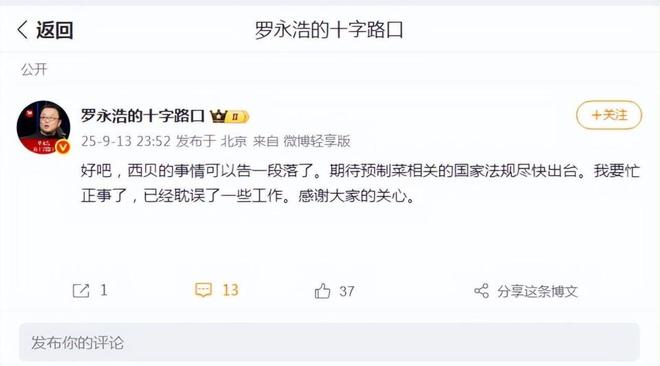根据Meike AI的消息,9月13日,Luonhao在微博上发布了:嗯,Xibei的对象结束了。我们期待尽快引入与预制菜有关的国家法规。我将忙于自己的业务,并推迟一些工作。感谢您的记忆。 Luo Yonghao的Weibo屏幕截图资料来源:@luo Yonghao的十字路口